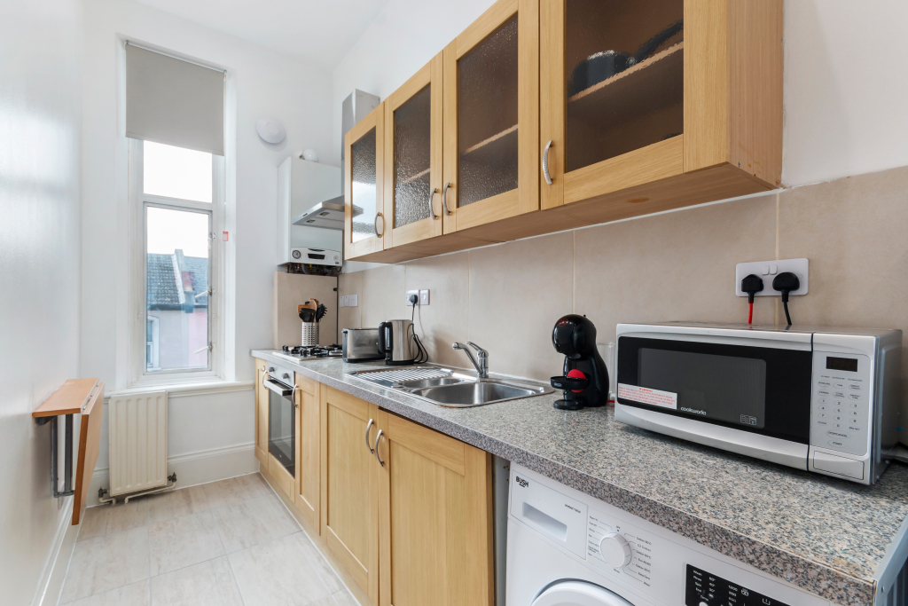 A fully equipped kitchen with an oven, microwave, and a washing machine, perfect for self-catering.